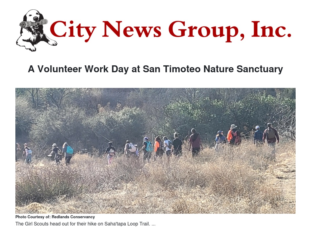 Saturday was a wonderfully busy day for Redlands Conservancy's sites. Volunteer Land Manager Martin held a volunteer work day at San Timoteo Nature Sanctuary. He reported that 18 folks came out from local Catholic parishes and the community. They worked for 2 1/2 hours on planting natives, and taking care of the trails. At Gateway Ranch, a group of girl scouts took over The Watering Hole for their workshop on hiking safety, and Redlands Conservancy board member Bettina McLeod directed an Eagle Scout project in the Habitat Garden. As all this was going on, several individuals and small groups headed up the Saha'tapa Loop Trail. This is how Redlands Conservancy envisions Redlanders and visitors using the land and sites we take care of. All are welcomed.