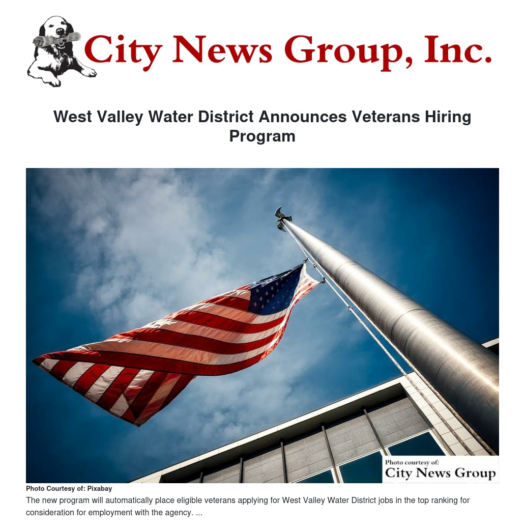West Valley Water District Announces Veterans Hiring Program