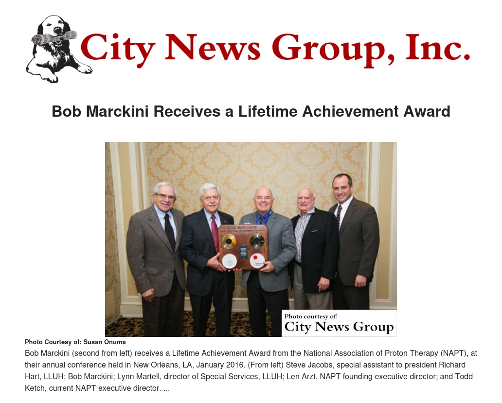 The National Association of Proton Therapy recognized Bob Marckini with their Lifetime Achievement Award at their annual conference held in New Orleans, LA last month.