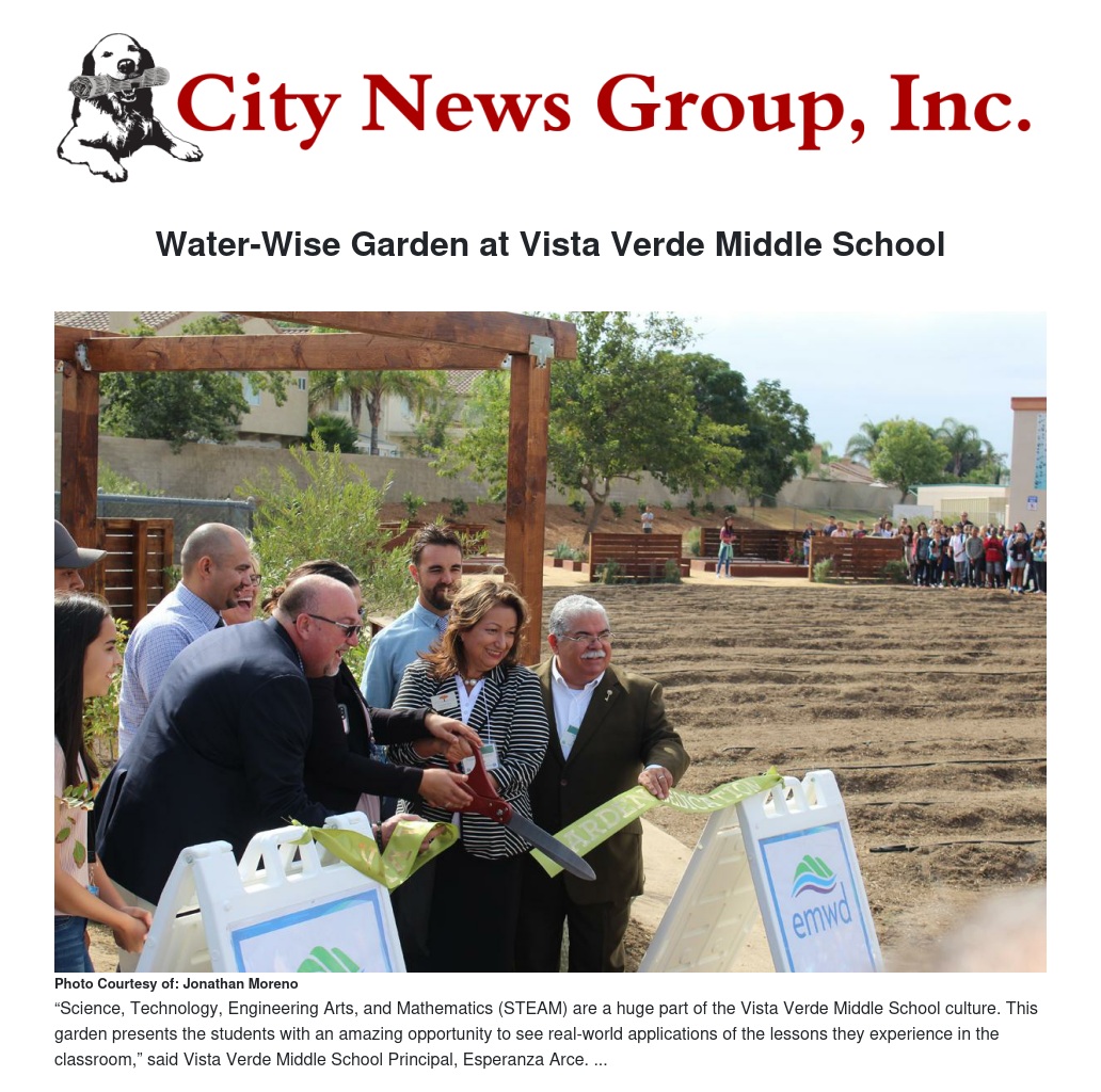 The Eastern Municipal Water District (EMWD) and Val Verde Unified School District on Wednesday, September 20, 2017, celebrated the dedication of a new water-wise garden at Vista Verde Middle School that was funded through a federal program which aims at reducing water use in schools. Vista Verde Middle School students, administrators, district officials, city representatives, and officials from EMWD gathered together to dedicate the garden earlier this morning.