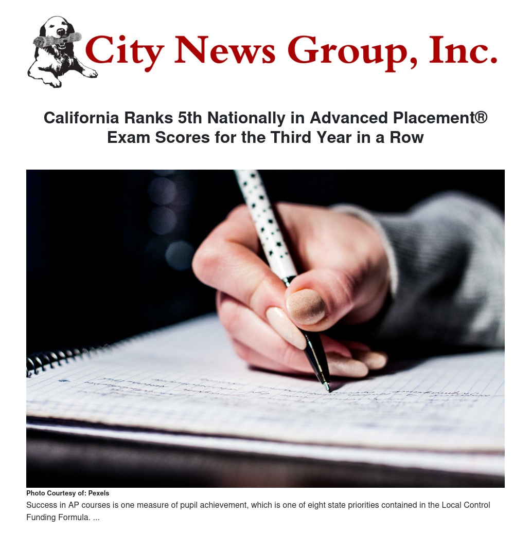 State Superintendent of Public Instruction Tom Torlakson announced that for the third year in a row, California students placed fifth in the nation in the percentage of high school graduates who earned a score of three or more on an end-of-course Advanced Placement ® (AP) exam, which earns them college credit.