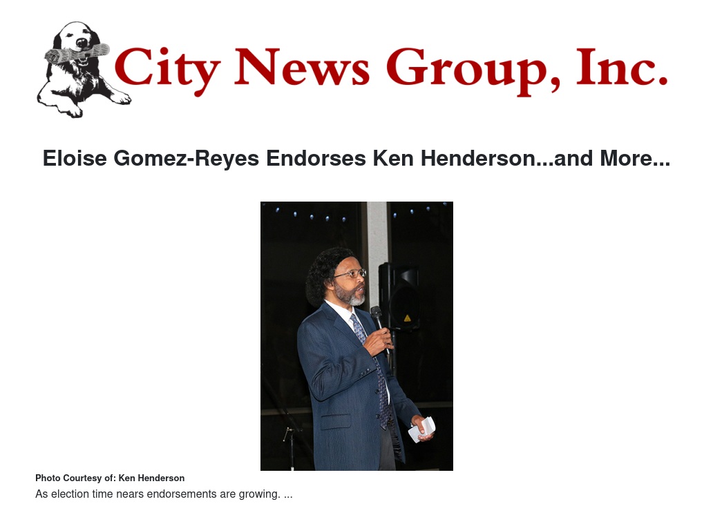 Eloise Gomez-Reyes, Assembly Member for the 47th District, and Grand Terrace resident, has endorsed Council Member Ken Henderson for the Grand Terrace City Council 2-year seat. In a telephone conversation on October 10, 2018, Assembly Member Gomez-Reyes indicated, “I believe you are, absolutely, the right person for the job and the person best equipped to help lead Grand Terrace to a prosperous future. I am very pleased to endorse your campaign for the Grand Terrace City Council”.