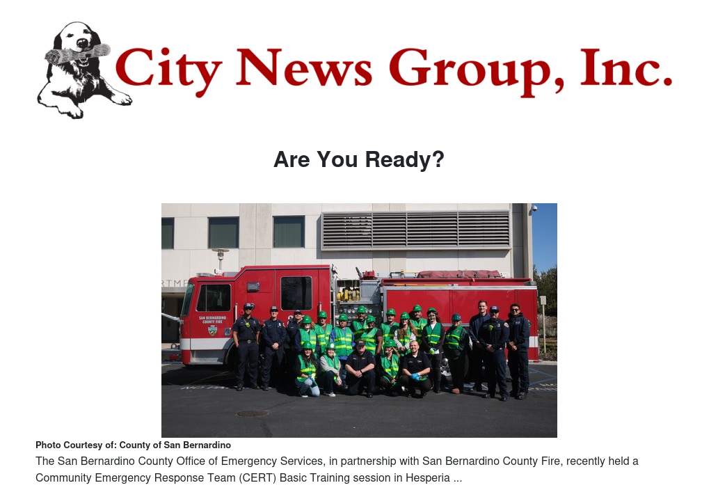 San Bernardino County is not acting alone when it comes to emergency preparedness. The San Bernardino County Office of Emergency Services (OES) is excited to offer free Community Emergency Response Team (CERT) training opportunities throughout the county, with sessions hosted by various cities, towns and County OES.
