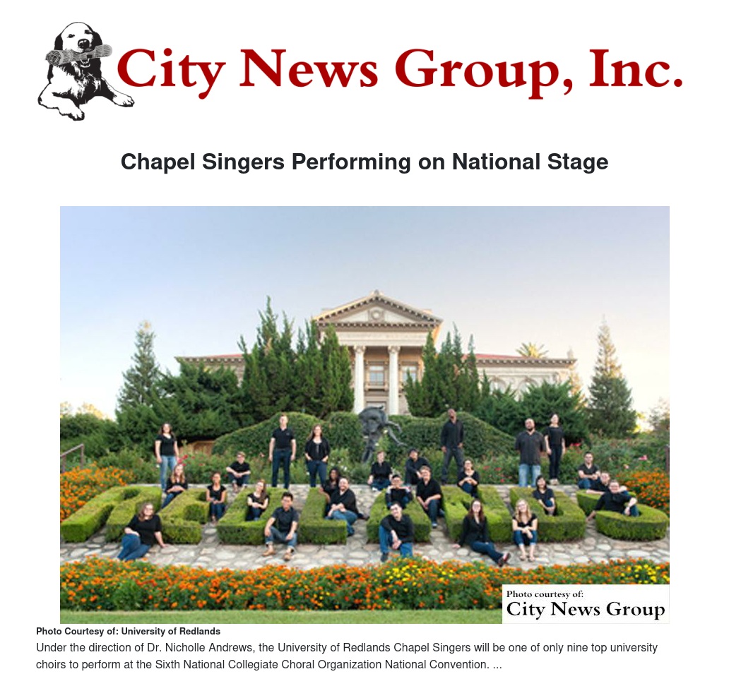 The University of Redlands School of Music Chapel Singers has been chosen to perform with some of the top schools in the country at two major national conventions, continuing its long-standing tradition and reputation of musical excellence in the United States and across the globe.