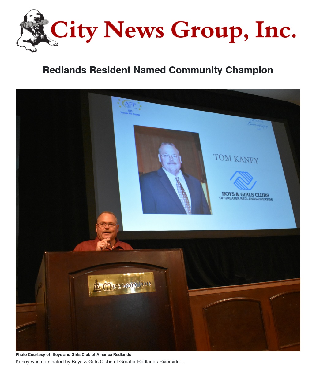 Kaney was recognized with other honorees at AFP’s annual Philanthropy Day lunch at the Mission Inn Nov. 12. Other honorees included Rochford Foundation founders and Burrage Mansion owners Tim and Carol Rochford.