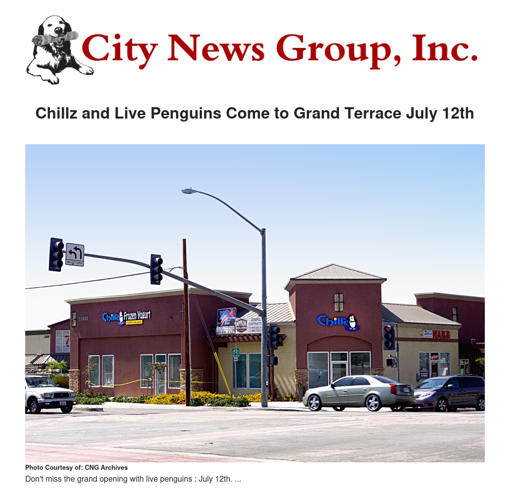 As you may have already noticed from the new blue signs on the corner of Barton and Mt. Vernon Ave., Grand Terrace will be home to a new brand of frozen yogurt shops, named Chillz Frozen Yogurt.