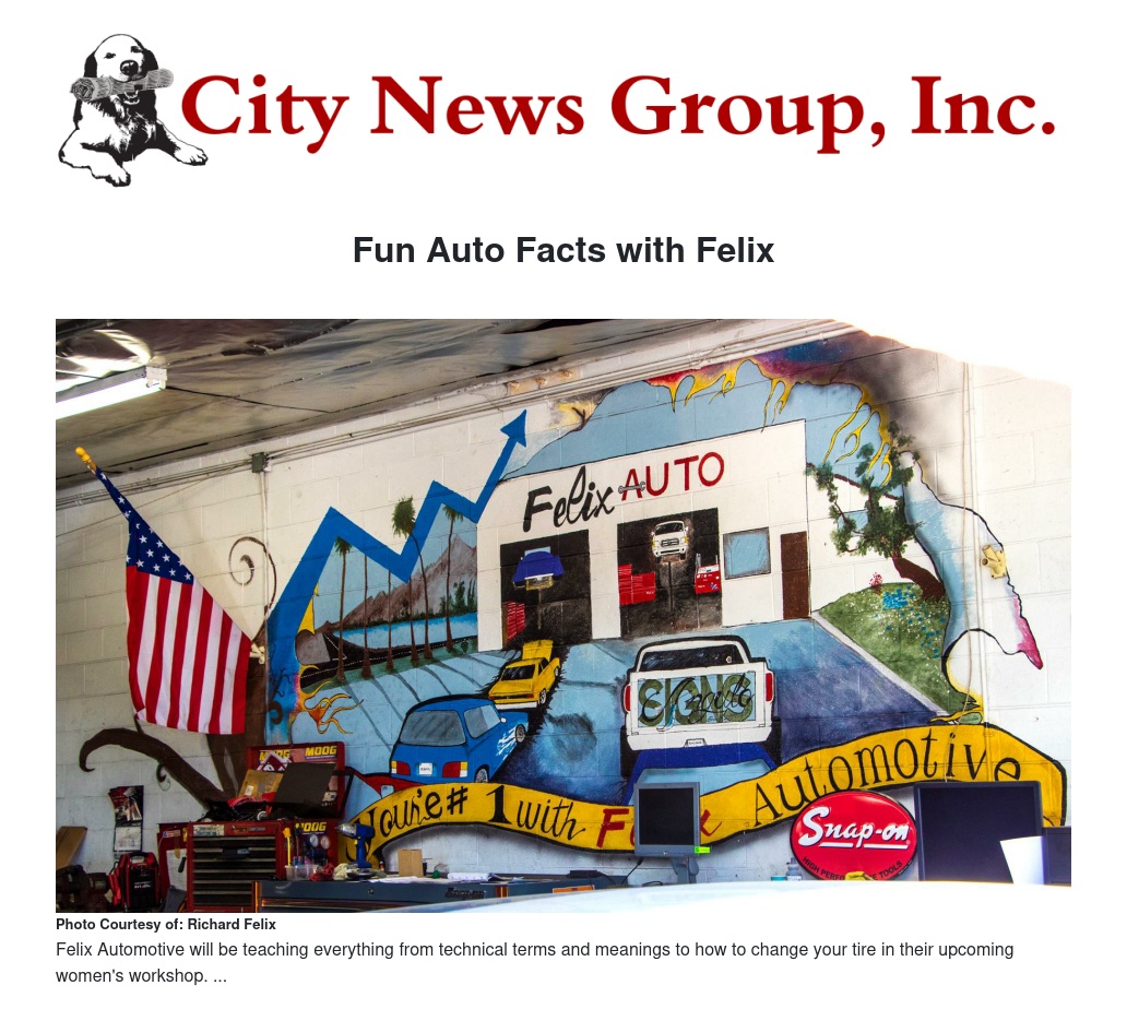 Felix Automotive, located in San Bernardino, is doing something absolutely amazing for women like me.  They are putting on a three-part Workshop for Women, teaching us incredibly important automotive skills so that we don’t have to worry as much when we experience potentially dangerous automotive situations.  I am beyond excited about this.  It is an unfortunate reality that we, as women, sometimes get taken advantage of in stressful situations, like when we take our cars in to get repaired and get overcharged because they think we don’t know any better.  This is real.  This DOES happen.  But because of Felix Automotive, we can gain some independence and some serious knowledge so that this no longer happens.