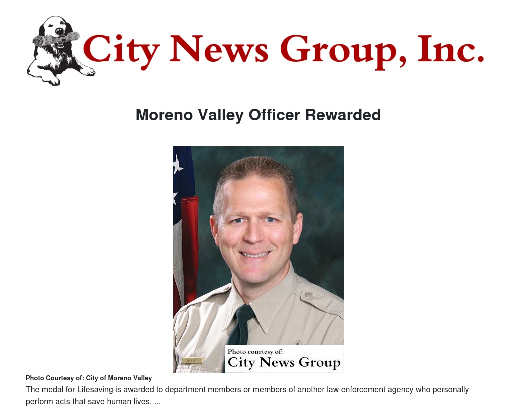 MORENO VALLEY>> The City of Moreno Valley Law Enforcement Appreciation Committee for Exceptional Lifesaving honored officer Jay Willner for his heroic efforts in saving a severely injured man from his horrific injuries.