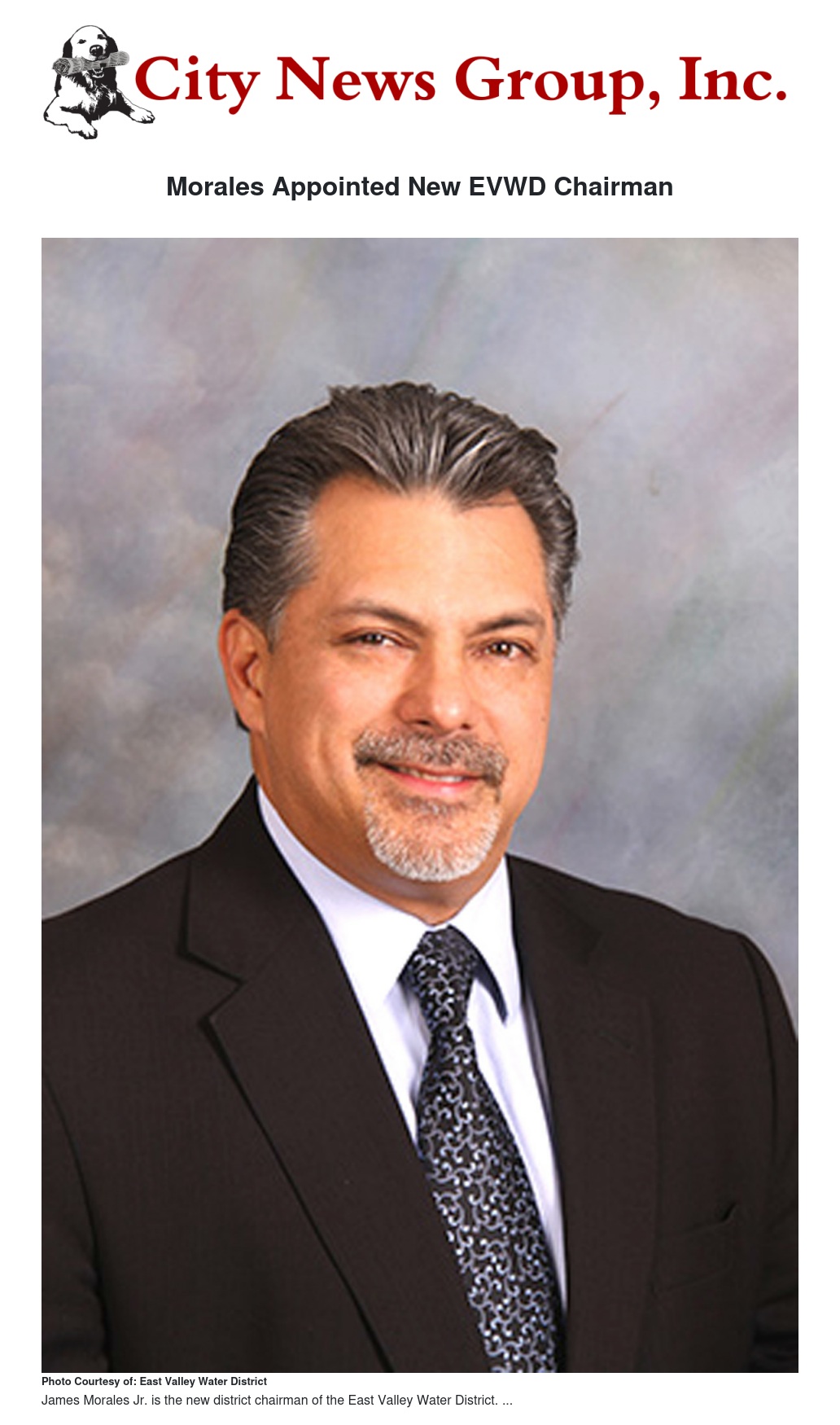 Morales, Jr. was elected to the East Valley Water District Governing Board in April 2008, served as the vice-chairman from 2011-2013 and has now been appointed chairman. Morales decided to become a leader of East Valley Water District because of his desire to serve as a role model for his family and his sense of civic duty. Maintaining a quality water supply within a reliable water delivery system remains a priority for Morales. Since becoming a board member, the district has implemented additional efforts to provide transparent and accountable information regarding finances and operations to the community.