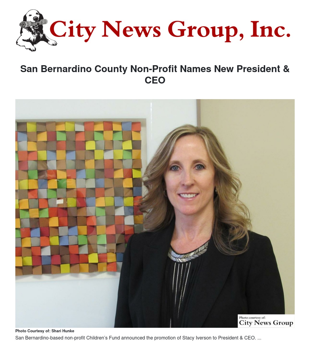 San Bernardino-based non-profit Children’s Fund announced the promotion of Stacy Iverson to President & CEO. The announcement was made by Lee Jackman, Chair of the Board of Children’s Fund.