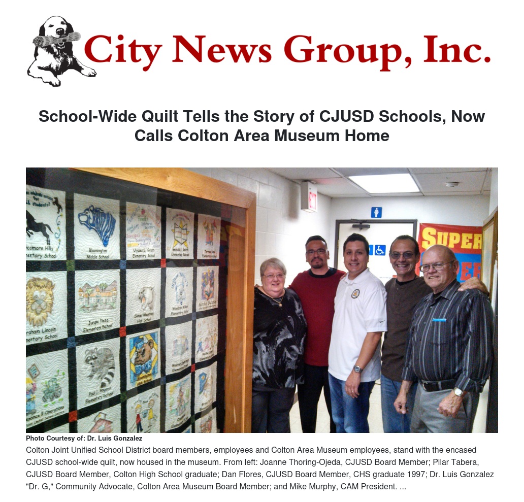 "The Colton Joint Unified School District quilt is a concrete example for children of how they 'belong' to the city/community," said the district's newest board member, Joanne Thoring-Ojeda. "Residents of a community are part of its present and, in time, its history. This quilt is a novel approach to keeping this message alive and reminding students, young and old, that their experiences within the district are part of the history of the Colton community. Safeguarding it as an historical artifact at the Colton Museum is a statement of the important role schools have on individuals within our community. Schools help shape the culture of communities."