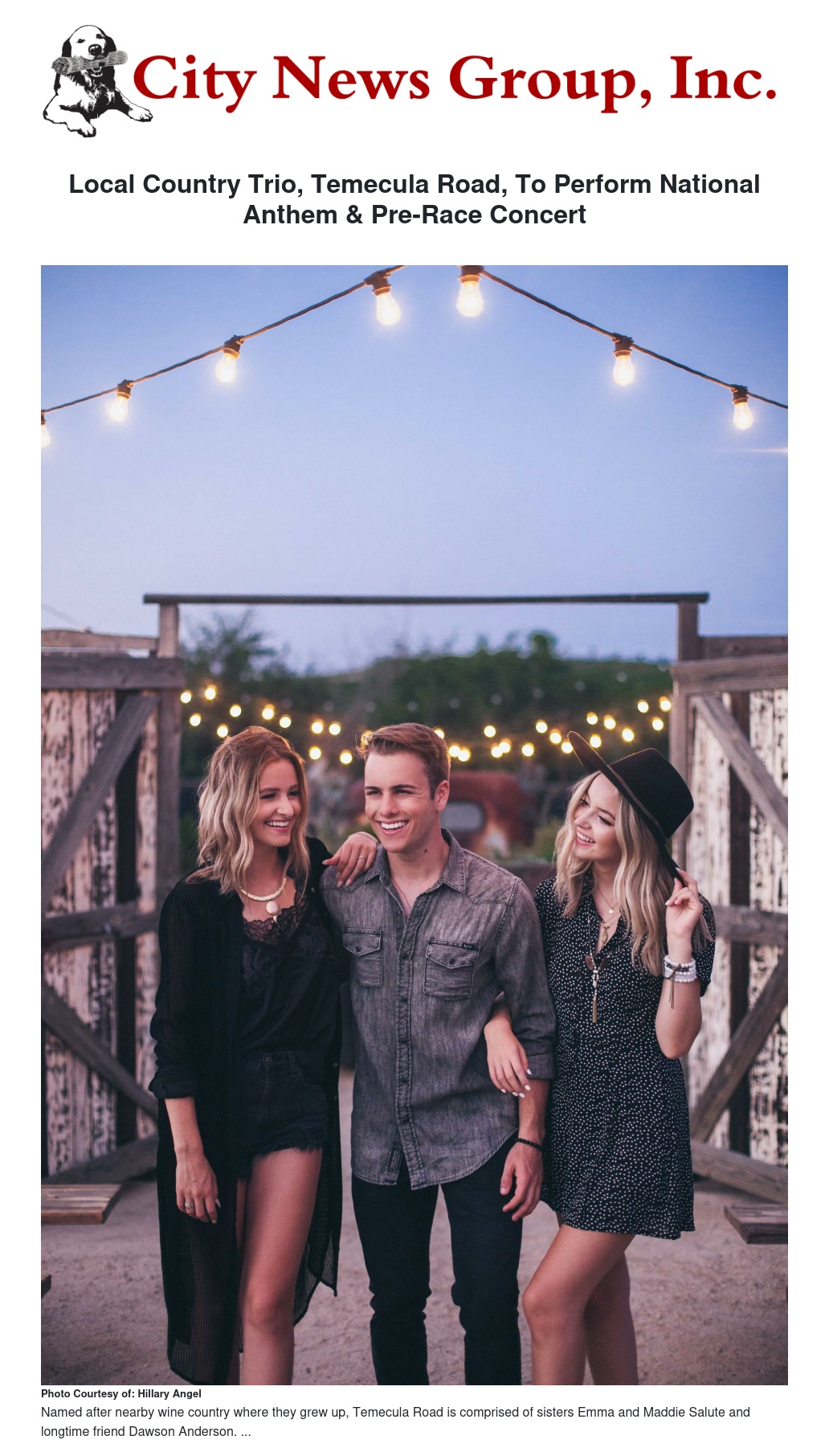 Local Country Trio, Temecula Road, To Perform National Anthem & Pre-Race Concert by Hillary Angel - City News Group, Inc.