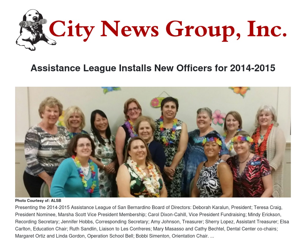 The Assistance League of San Bernardino recently thanked their out-going executive board and welcomed the incoming 2014-2015 executive board at the Assistance League chapter house in San Bernardino.