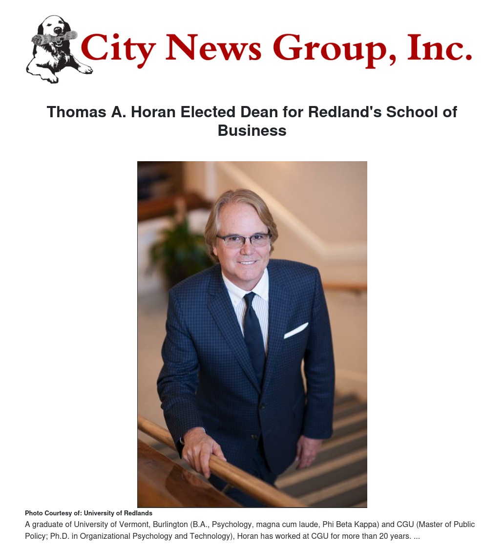 REDLANDS>> The University of Redlands announced today that Thomas A. Horan, previously dean of the Claremont Graduate School’s (CGU) Drucker School of Management, has been named dean of University of Redlands School of Business, effective July 1.