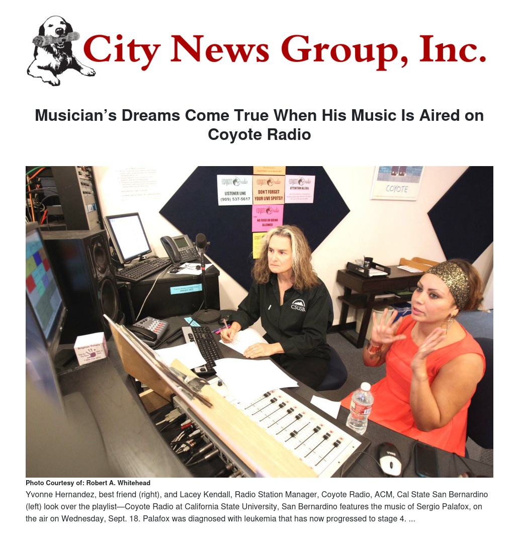 Sergio Palafox’s lifelong dream came true on Wednesday, Sept. 18, when his music was played on the radio. Diagnosed with leukemia in January 2010 and very weak as a result of the disease, he told employees at Cal State San Bernardino’s Coyote Radio he didn’t think he’d get the chance to see that wish fulfilled.