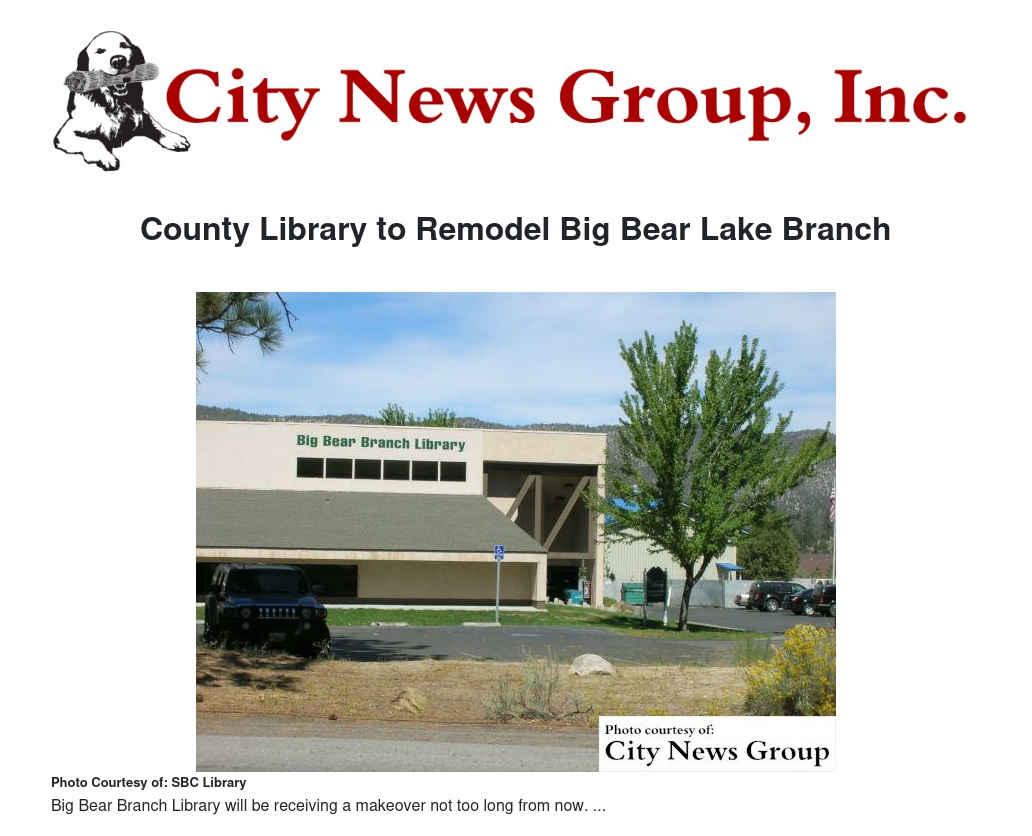 The County Library’s Big Bear Branch will undergo a remodel with fresh paint, new carpet, flooring, furniture and some reconfiguration of the existing layout. While the remodel is taking place, the library will temporarily close from April 11 to May 20. Customers are encouraged to visit the Running Springs, Lake Arrowhead or Crestline branch libraries during the remodel.