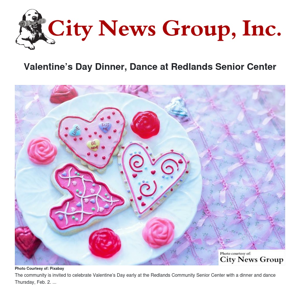REDLANDS>> The community is invited to celebrate Valentine’s Day early at the Redlands Community Senior Center with a dinner and dance presented in partnership with Linda Valley Senior Living and the City of Redlands Quality of Life Department Recreation and Senior Services Division.