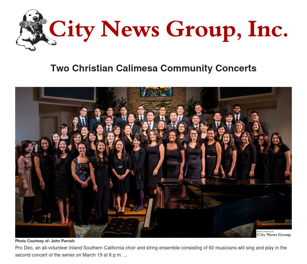 The second concert, on March 19 at 6 p.m., features Pro Deo, an all-volunteer Inland Southern California choir and string ensemble. The 60 musicians, whose Latin name translates as “For God,” will sing and play – all together and as vocal and instrumental soloists and small groups -- in a program of traditional hymns and contemporary worship music.
