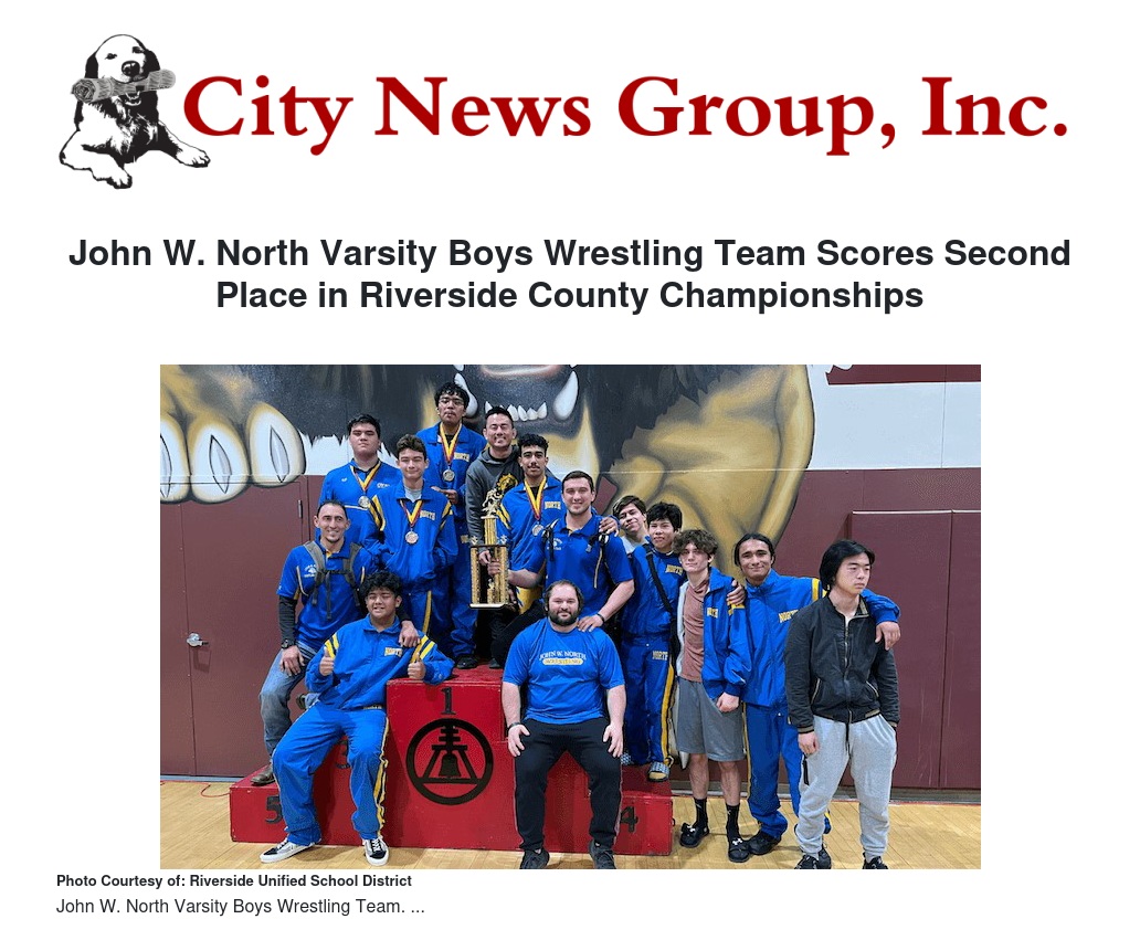 The John W. North Varsity Boys' Wrestling team finished in second place at the 2023 Riverside County Championships.