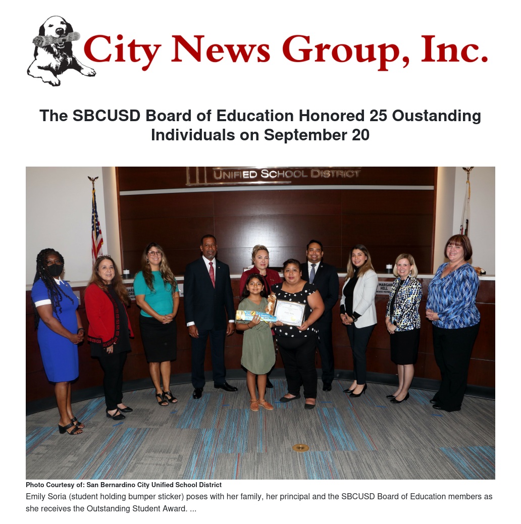 On Tuesday, September 20, 2022, the Board of Education presented the Outstanding Achievement Awards to students, parents, and staff at Cajon High School, Holcomb Elementary School, the Kendall-Harmon School complex, and Shandin Hills Middle School.