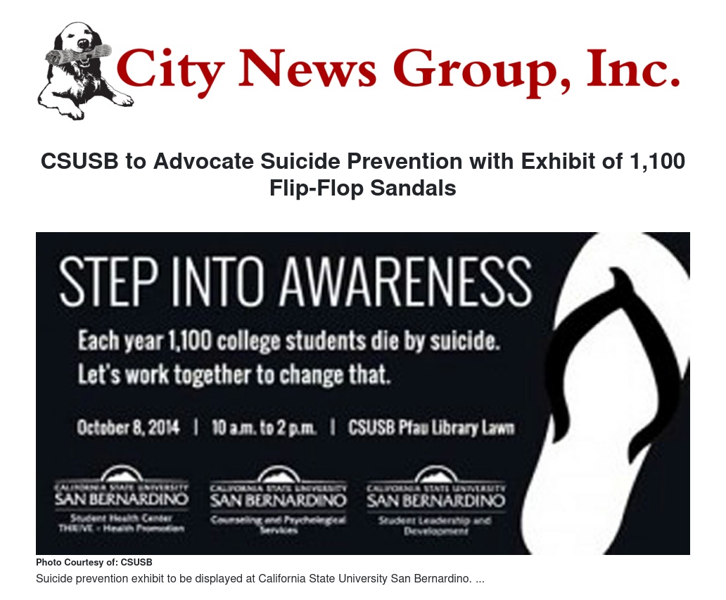 To create awareness for suicide prevention, Cal State San Bernardino’s Student Health Center will sponsor “Step into Awareness,” a display of 1,100 flip-flop sandals on Wednesday, Oct. 8.