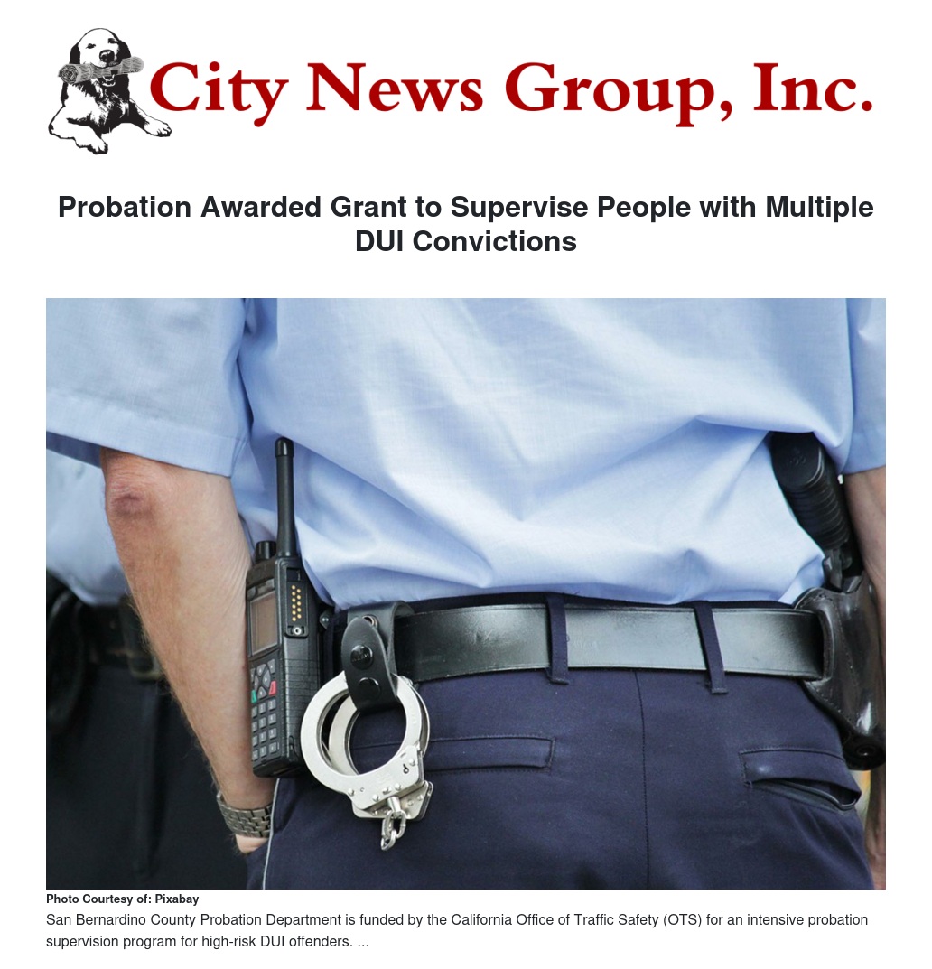 The San Bernardino County Probation Department received funds for an intensive probation supervision program for high-risk DUI offenders with multiple DUI convictions.