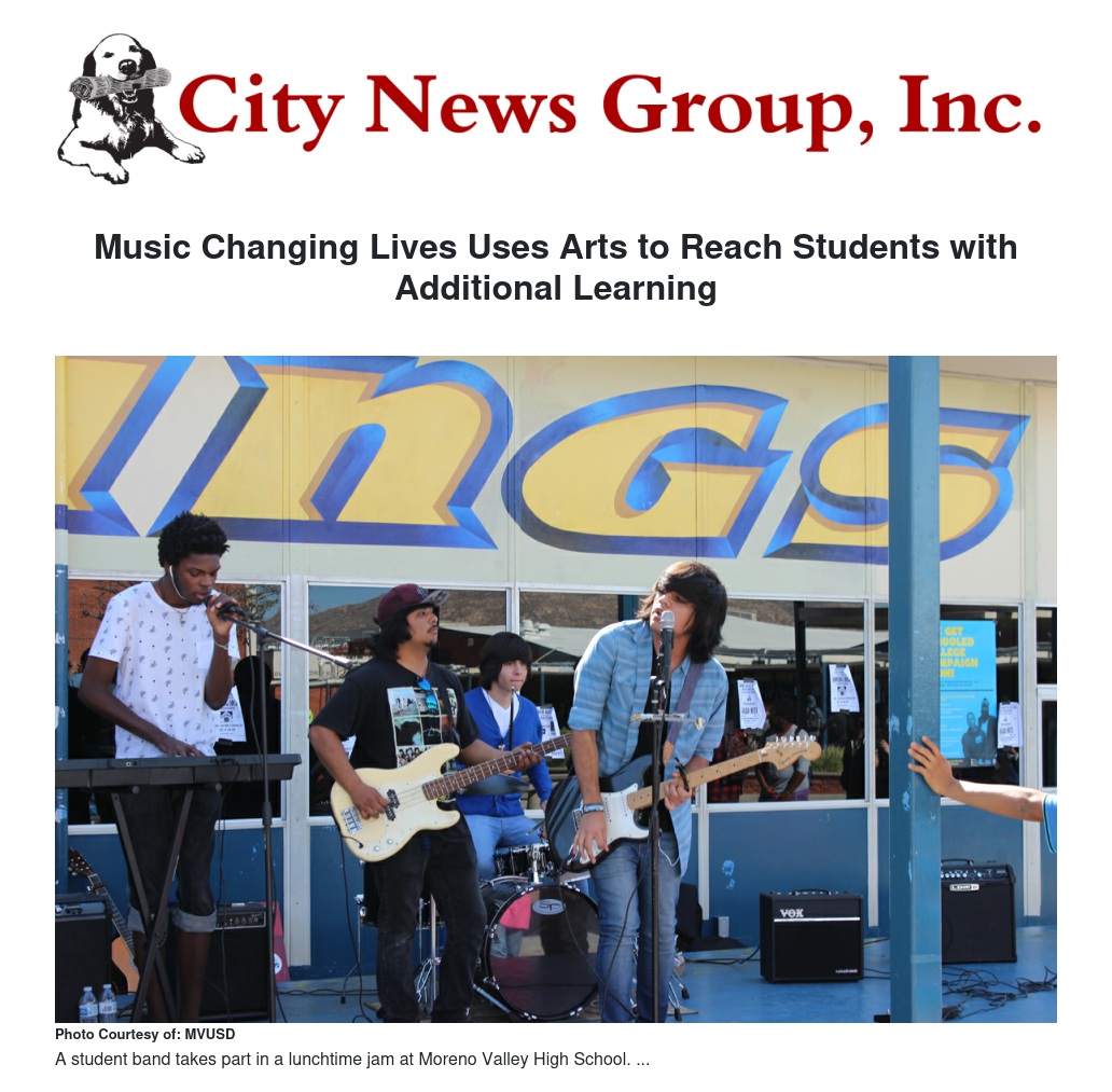Working with Moreno Valley and Vista del Lago high schools, Music Changing Lives supplements visual and performing arts offerings by turning classrooms into after-school music and art studios where students are able to practice their skills, and record and produce their music and occasionally entertain classmates with a lunchtime jam.