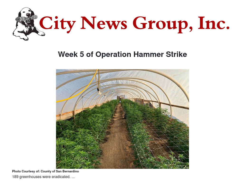 San Bernardino County Sheriff’s personnel arrested 38 suspects. Investigators seized nearly 25,000 marijuana plants, more than 9,600 pounds of processed marijuana, 10 guns, and $302,000. Investigators eradicated 189 greenhouses at these locations, along with five residences that contained indoor cultivations. Investigators mitigated five electrical bypasses.