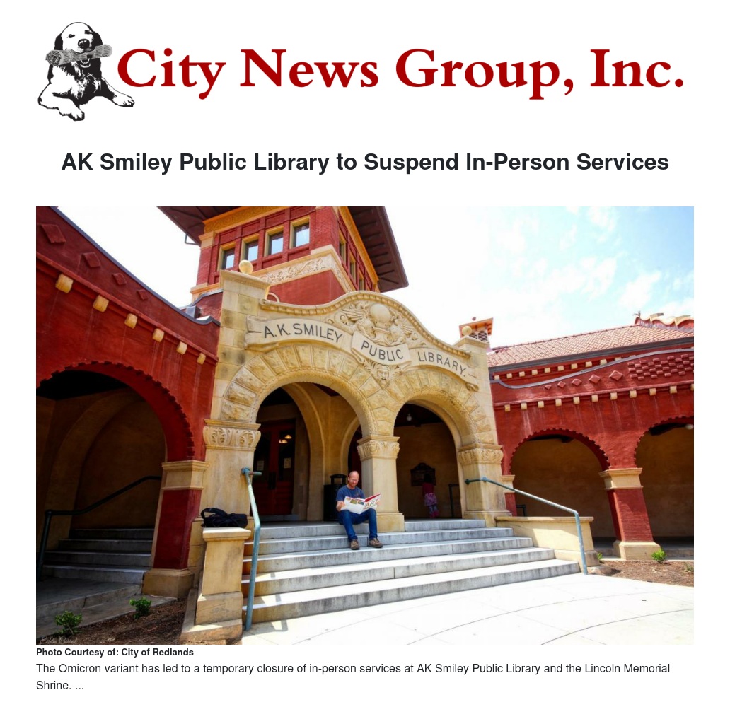 AK Smiley Public Library to Suspend In-Person Services by AK Smiley Public Library - City News Group, Inc.
