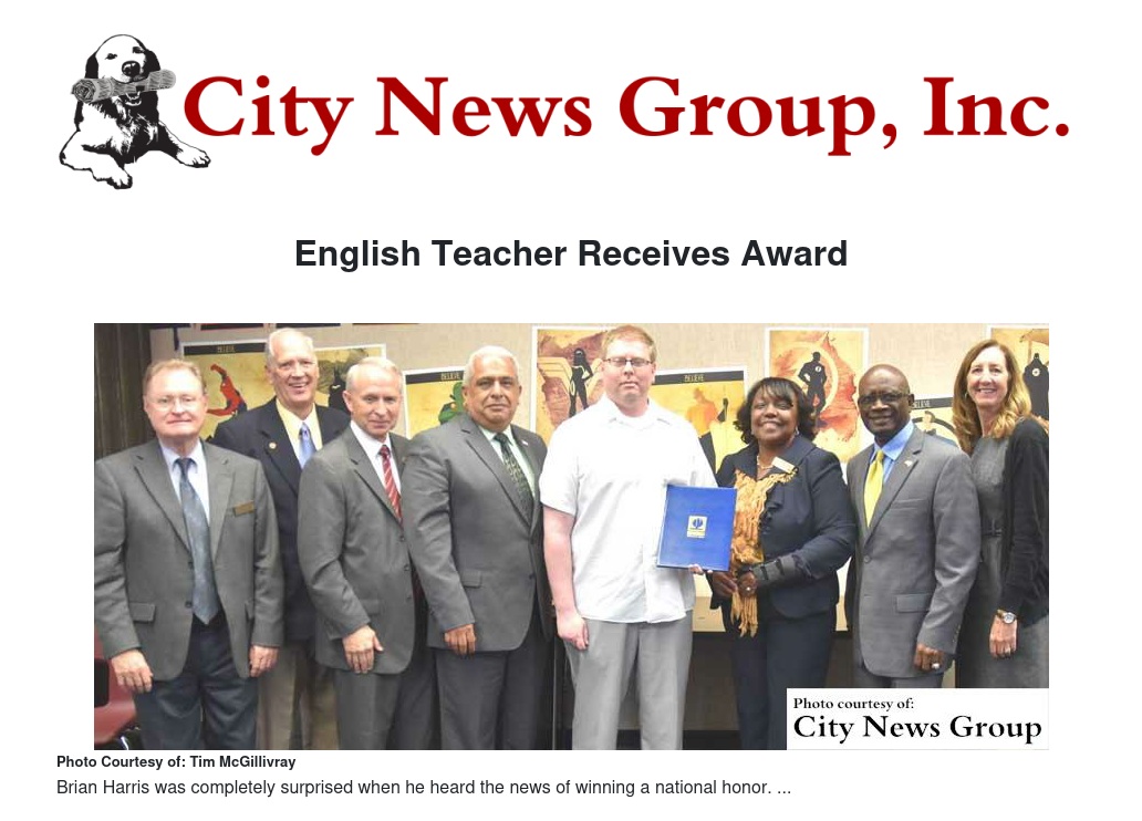 Harris was nominated for the national award by Superintendent Dr. Judy D. White, who wrote, “He seems to always be searching for ways to make school more enjoyable and enlightening for his students by allowing them to take ownership of their learning. Through hands-on, project-based learning, and an emphasis on student interaction and collaboration, Mr. Harris helps his students learn to help each other, and, in the process, discover their unique personalities and talents.”