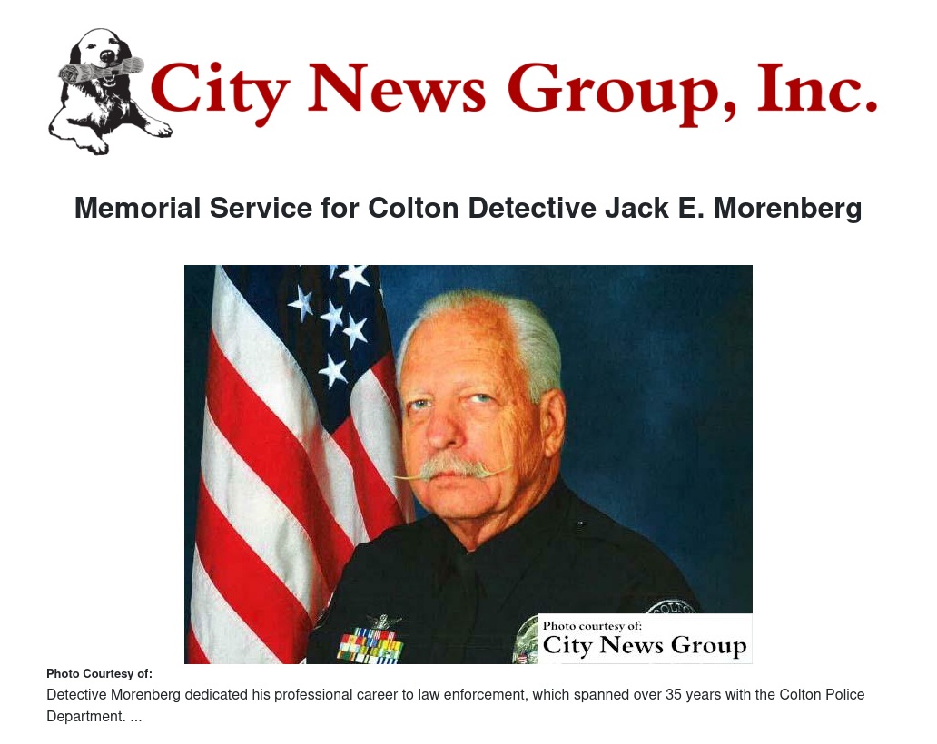 COLTON>> Thirty Five year Veteran, Jack E. Morenberg of the Colton Police Department recently passed away.  The City is working with the family on holding a formal Memorial Service to honor his years of service.