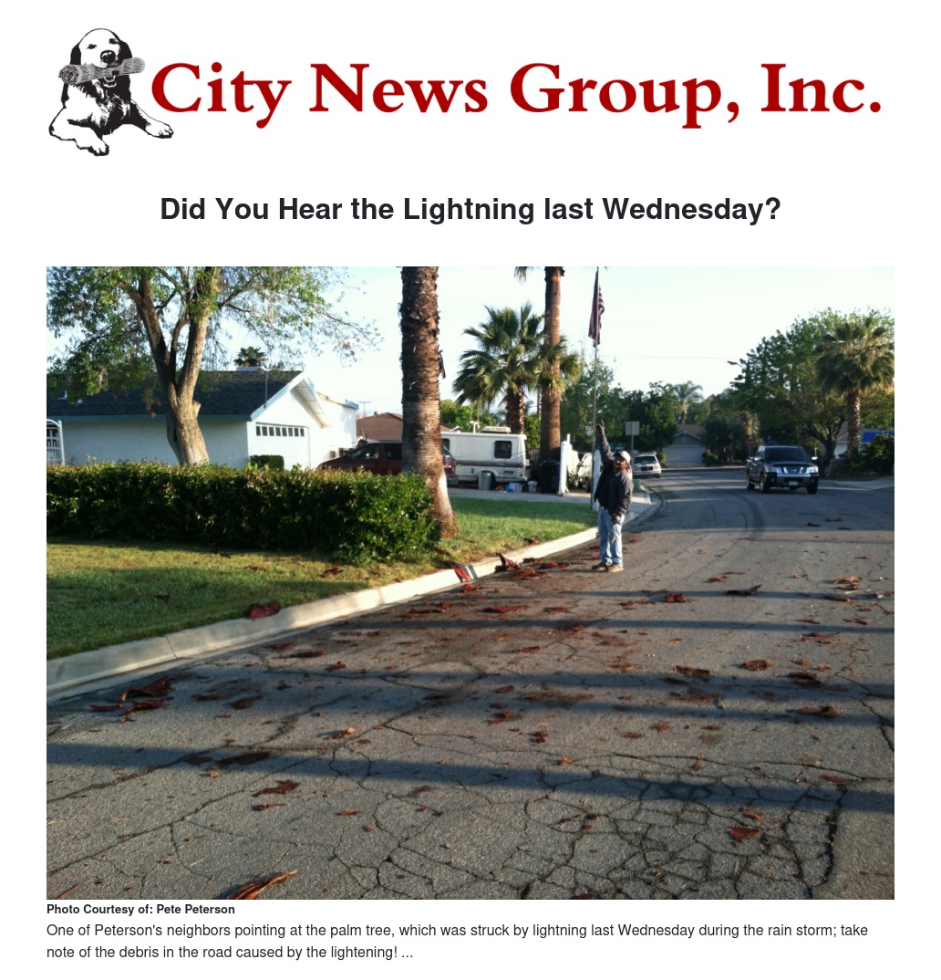 Along with April showers last week, came some springtime thunder. Longtime Grand Terrace resident Pete Peterson was surprised when a lightning bolt hit his palm tree last Wednesday around 5 p.m.