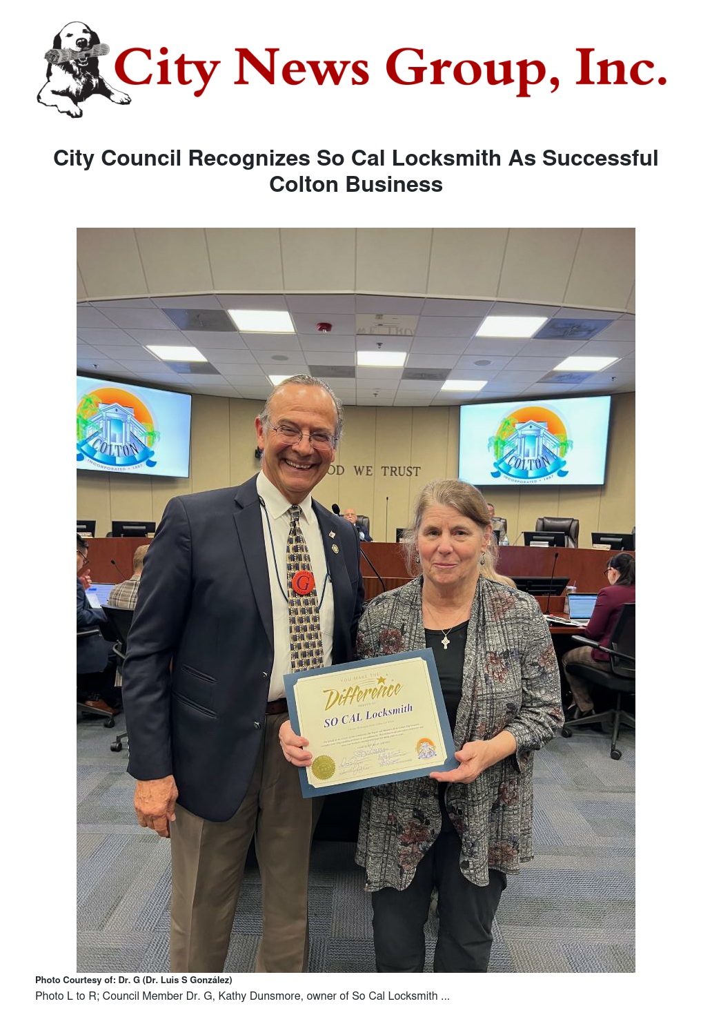 At the recent Council Meeting April 16, Council Member Dr.G (Dr. Luis S. González) presented Kathy Dunsmore, owner of So Cal Locksmith, with a “Business Focus” Recognition Award for her successful business operation in the City of Colton. This long-established company not only has become a mainstay of the business community but is recognized as a leader in locksmith service throughout the county and the region.