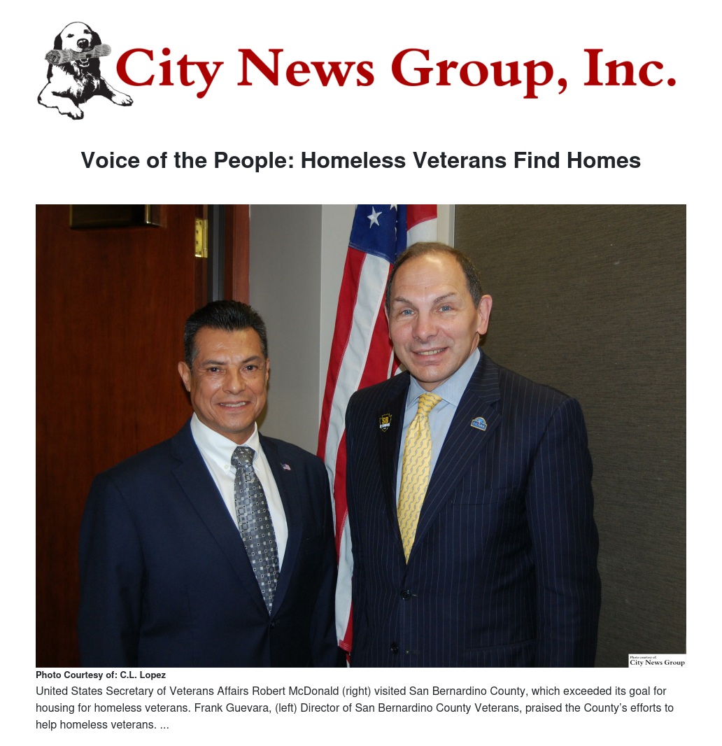 As a veteran, it is especially meaningful that San Bernardino County met its goal of finding housing for hundreds of homeless military veterans within our county. In less than six months, the 401 veterans originally identified by the County as homeless now have permanent housing. In addition, more than 100 veterans who became homeless or moved into the county were also assisted in finding housing. The county’s goal was not only met, it was exceeded. What has been accomplished in San Bernardino County is life changing for our heroes.