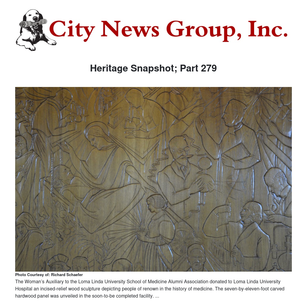 In early 1967, The Woman’s Auxiliary to the Loma Linda University School of Medicine Alumni Association donated to Loma Linda University Hospital an incised-relief wood sculpture depicting people of renown in the history of medicine. The seven-by-eleven-foot carved hardwood panel was unveiled in the soon-to-be completed facility. Mrs. Leland S. Loewen, President of the Woman’s Auxiliary made the presentation. The physicians’ wives had raised $5,000 to purchase the gift.