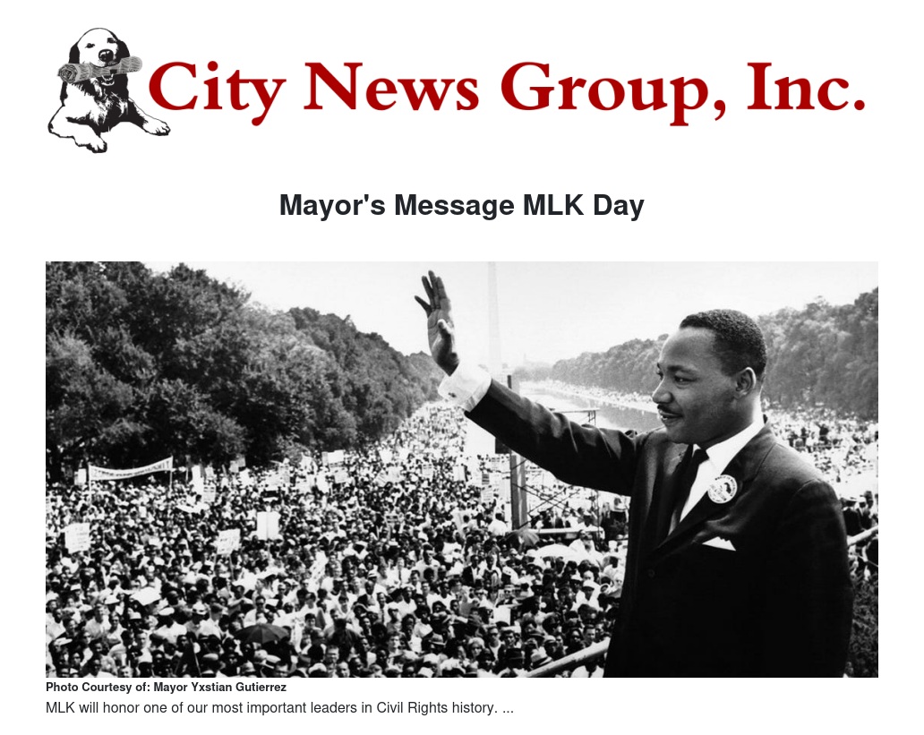 Dr. Martin Luther King Jr. was one of the most important leaders of the Civil Rights movement, and next Monday, January 20, is the federal holiday honoring his achievements and legacy. I am proud to live and serve as Mayor in a city that strives to embody Dr. King’s ideals of community.