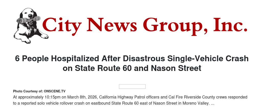MORENO VALLEY, CA — Six people were injured Sunday night following a single-vehicle rollover crash along California State Route 60 near Nason Street in Moreno Valley.