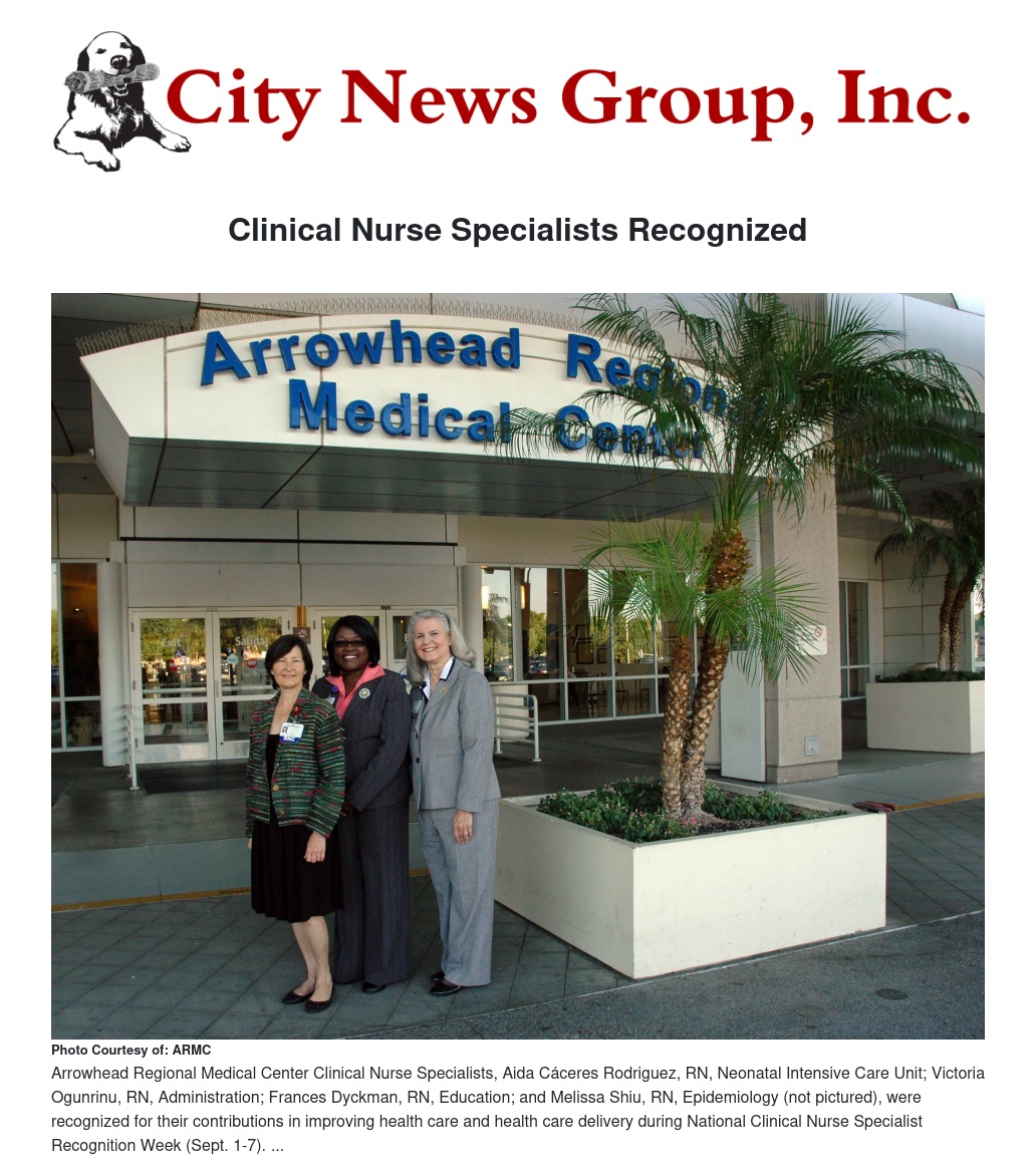 Clinical Nurse Specialists (CNS) are advanced practice nurses who play a unique and important role in ensuring that patients receive high quality care based on the best and most recent research evidence. Arrowhead Regional Medical Center (ARMC) is recognizing clinical nurse specialists for their contributions to improving health care and health care delivery during National CNS Recognition Week (Sept. 1-7).