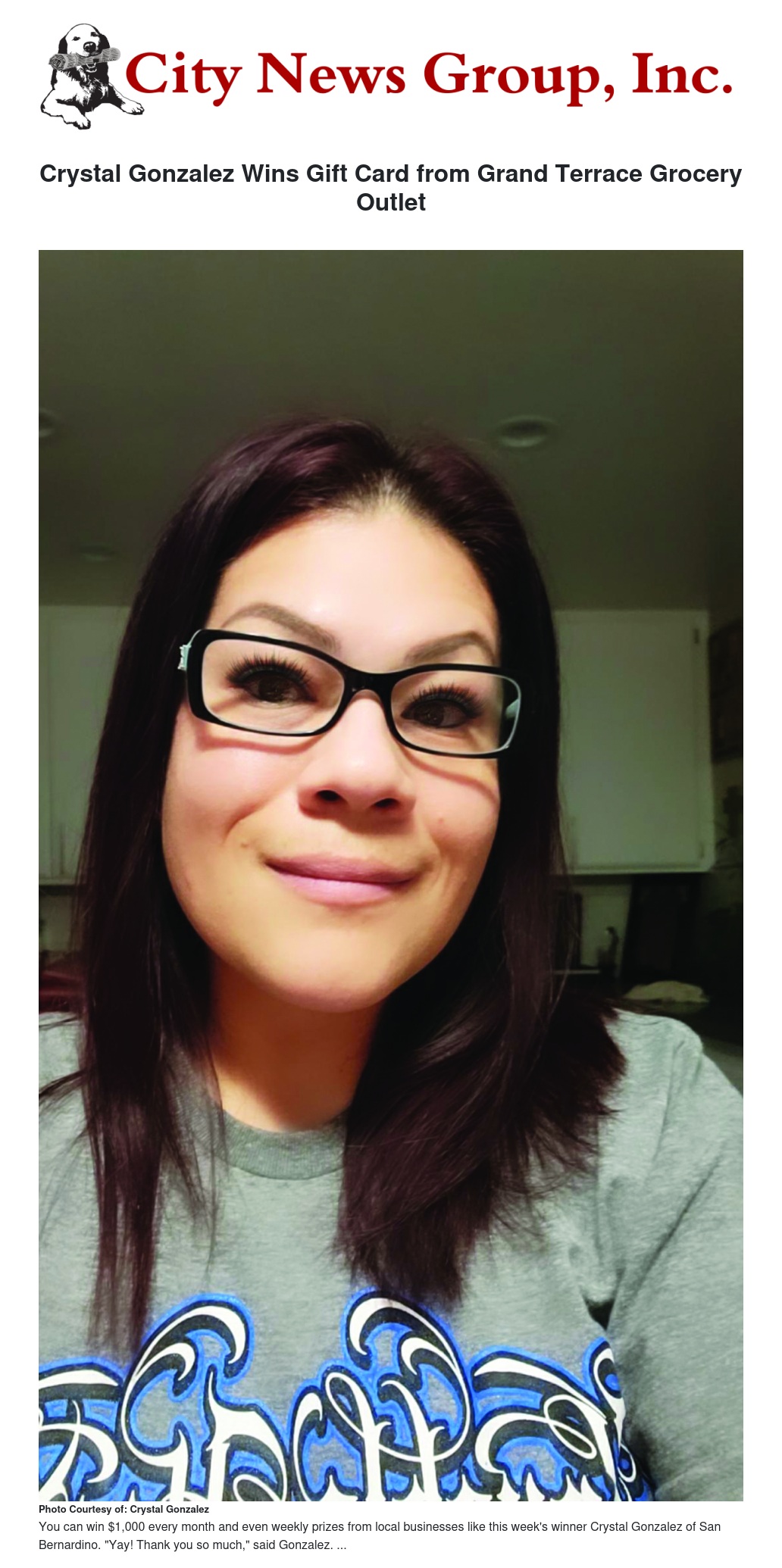 This week’s winner of a $30 Grand Terrace Grocery Outlet gift card is Crystal Gonzalez, resident of San Bernardino.
