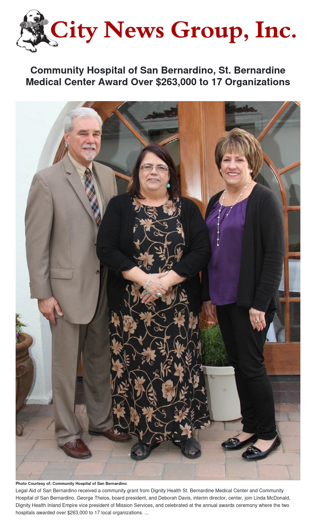 Through the contributions from each of Dignity Health’s 40 hospitals, including Community Hospital and St. Bernardine, in 2013, Dignity Health was able to fund more than $6 million in grant awards to nonprofit organizations in California, Arizona and Nevada. “Dignity Health’s Community Grants Program reflects our strong commitment to serve our community, not only as health care providers, but also as a partner to those who work to better the lives of others,” said Linda McDonald, Dignity Health Inland Empire vice president of Mission Services. “This year, Community Hospital of San Bernardino and St. Bernardine Medical Center are pleased to offer more than $263,000 to worthy organizations that provide important services such as youth development programs and resources that improve access to health and dental care for the underserved.” Since the Community Grants Program began in 1990, Dignity Health has encouraged hospitals to expand their health care mission beyond the hospital campus. The 2013 Community Grants cycle marks the 23rd year of this program. Since 1990, Dignity Health has awarded $51 in grants in the tri-state area.