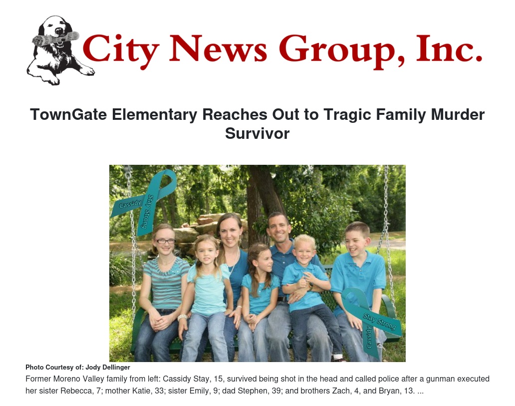 Today she is regarded as a tragic hero after surviving the slaying of the rest of her family in July, but 15-year-old Cassidy Stay is remembered fondly by staff at TownGate Elementary as an enthusiastic student and voracious reader while attending there from kindergarten through fifth grade. Now her TownGate family is reaching out to her.