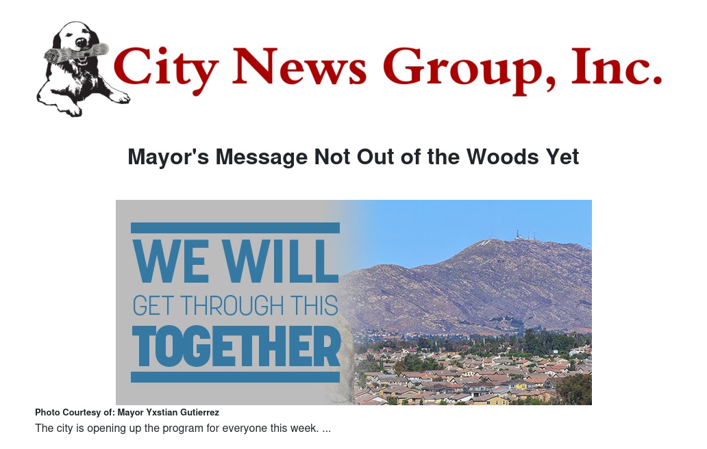 Mayor's Message Not Out of the Woods Yet by Mayor Yxstian Gutierrez - City News Group, Inc.
