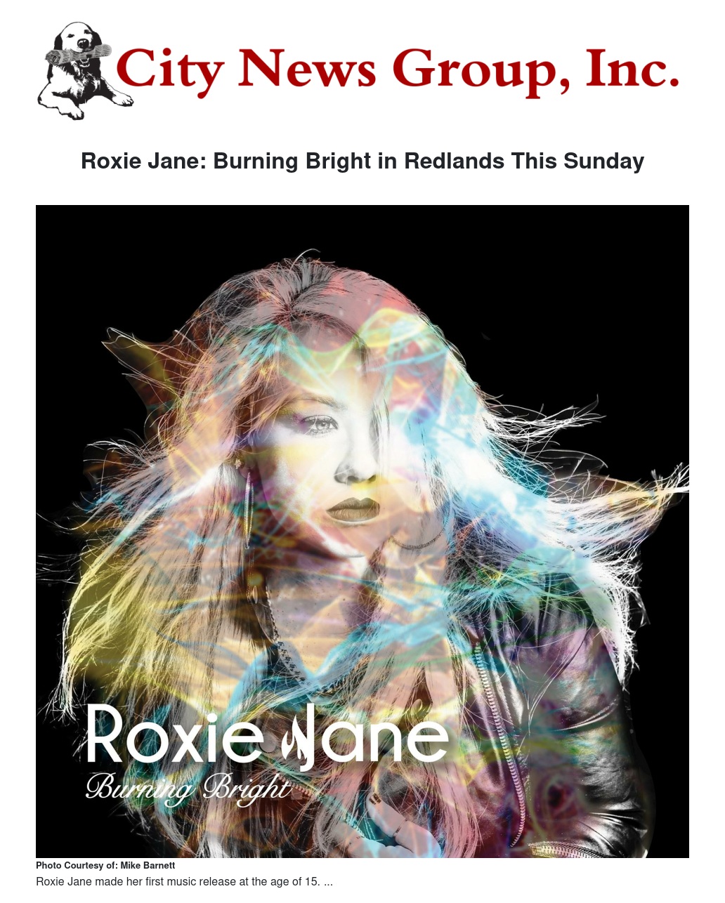 This Sunday night, Roxie Jane will take the stage with her new band at The District in Redlands. She’s introducing her latest pop music album entitled, “Burning Bright” at a free album release concert & party open to the public. Her new music is a refreshing form of positive pop music that has infectious hooks to pull the listener in. Roxie is seeing early signs of interest from her latest offering. Her first music video for her song, “You & I” has over a million views on her Facebook page (RoxieJaneMusic), and she has over 200,000 followers on social media.