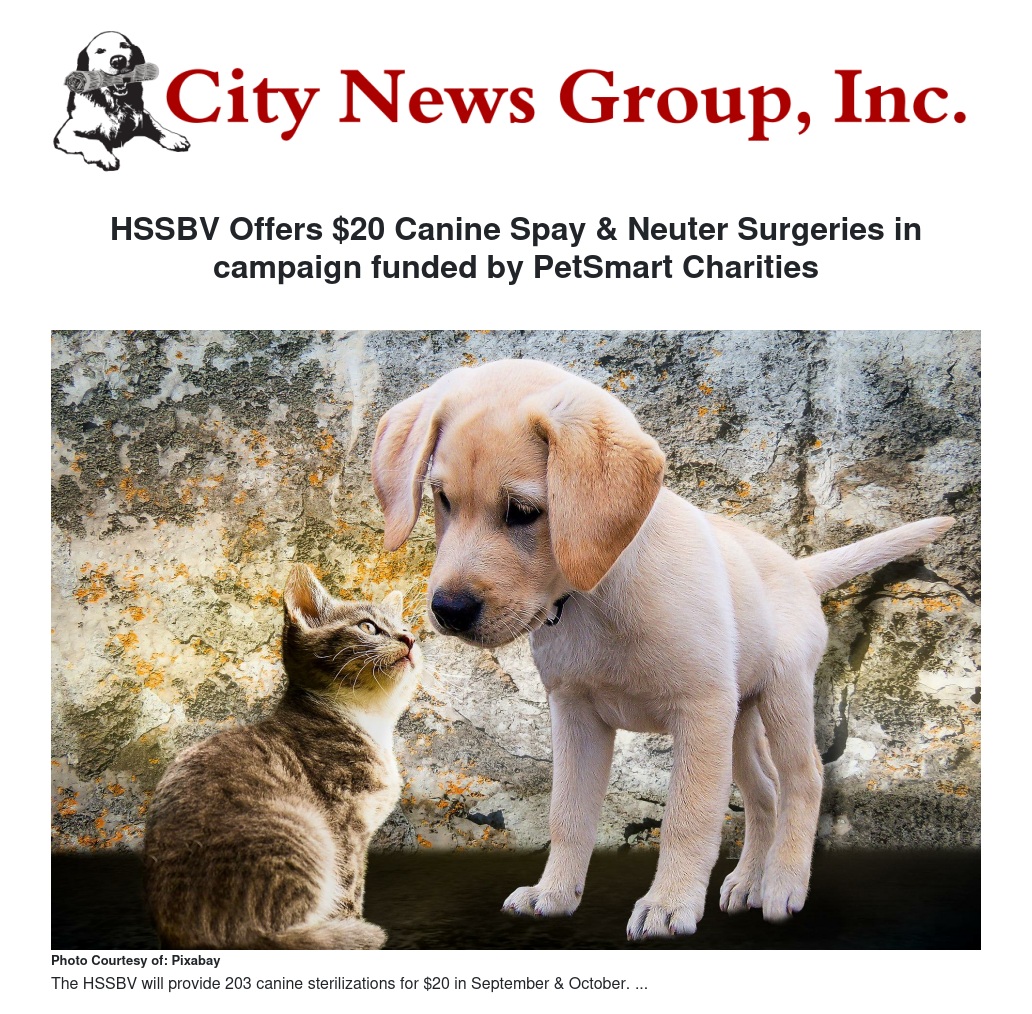 HSSBV Offers $20 Canine Spay & Neuter Surgeries in campaign funded by PetSmart Charities by Jill Henderson - City News Group, Inc.