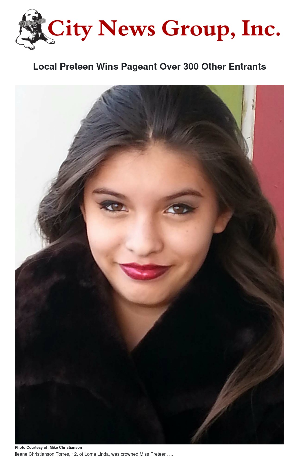 Ileene Christianson Torres of Loma Linda recently won the coveted Miss Preteen, Los Angeles, Pomona, and San Bernardino, first place award.