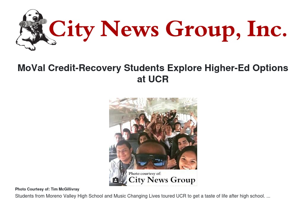 The students participated in workshops on financial aid, college life, college activities and clubs, and how to select a major. The field trip was organized by Josiah Bruny, director of Music Changing Lives, a club that sends UCR students to MVHS every Wednesday after school to help teach students to play an instrument, write poetry, paint, create cartoons, get tutoring and to help with homework.