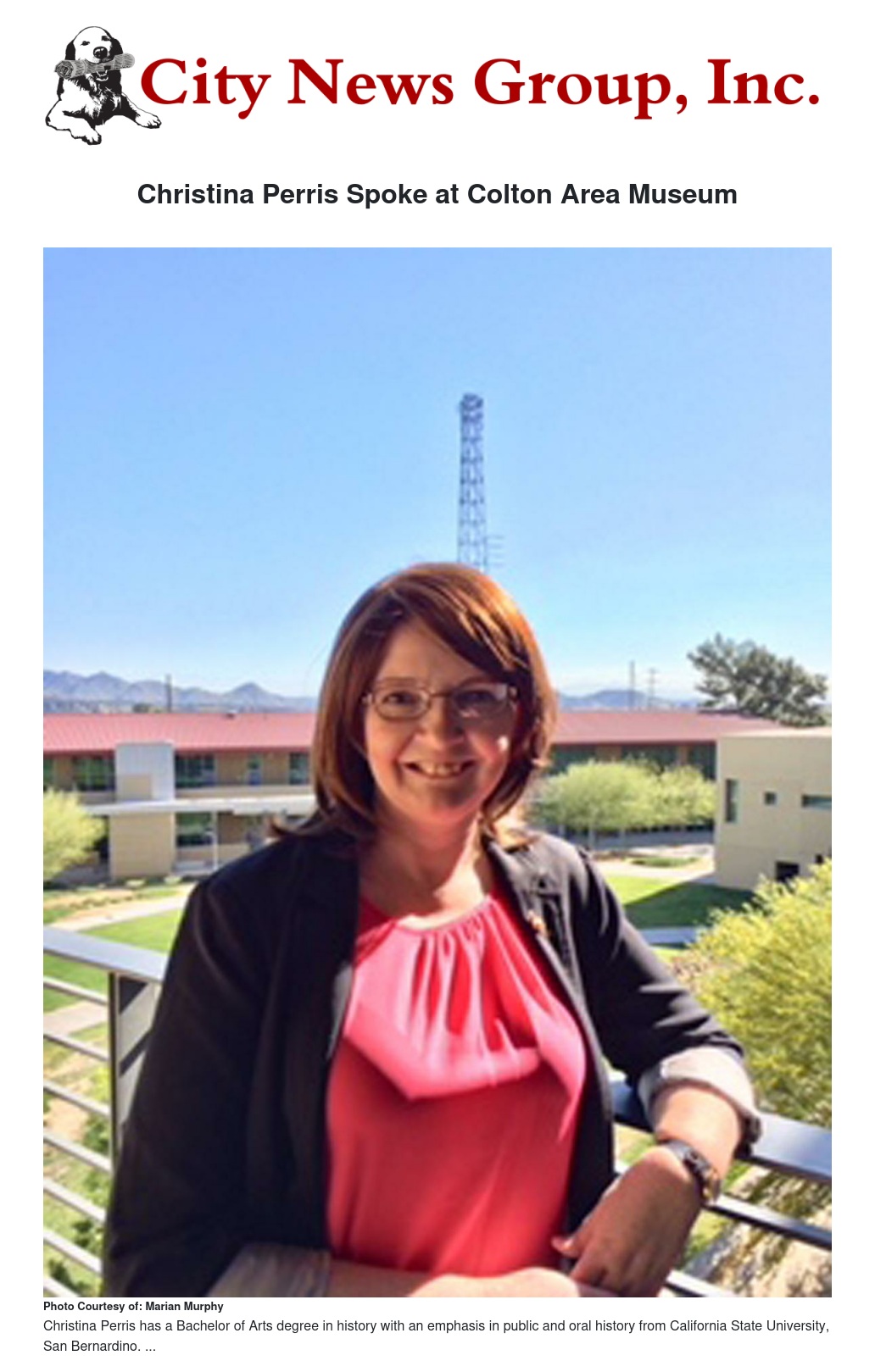 Christina Alanne Perris, MA, BA, is also an adjunct history instructor at San Bernardino Valley College where she teaches United States History to 1877 and has taught United States history, 1865 - present and World History to 1500. She holds a Master of Arts degree in history and archival studies from Claremont Graduate University (2013), A Bachelor of Arts degree in history with an emphasis in public and oral history from California State University, San Bernardino (2009) and an Associate of Arts degree in psychology from Crafton Hills College (2000). She is currently a docent and director on the Board of the Colton Area Museum.