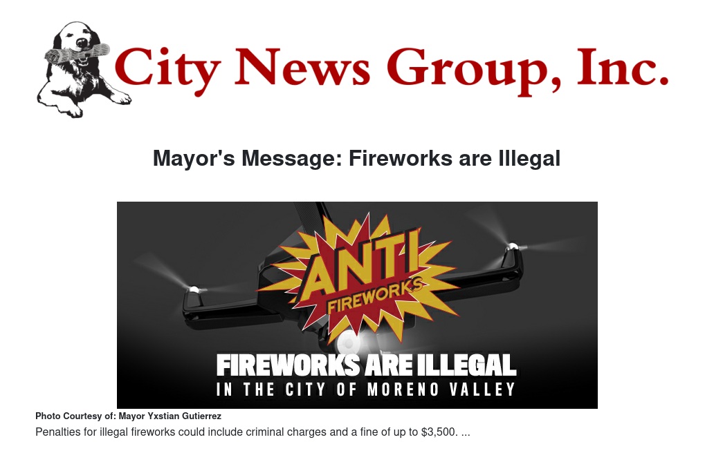 Mayor's Message: Fireworks are Illegal by Mayor Yxstian Gutierrez - City News Group, Inc.
