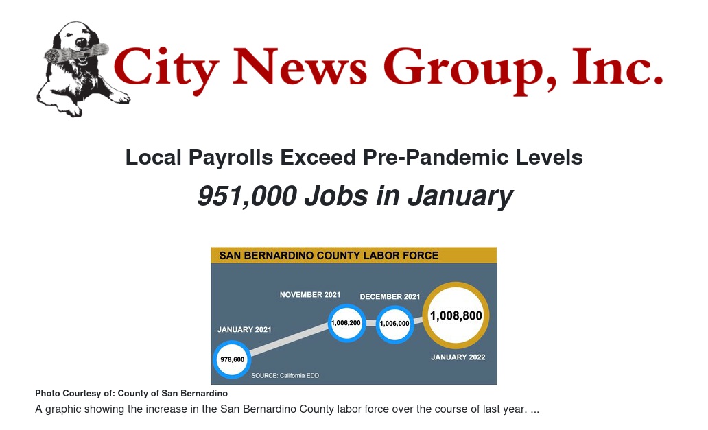 San Bernardino County’s job market has surged past pre-pandemic levels, with payrolls over 950,000 for the third month in a row, according to an analysis of newly released state numbers.