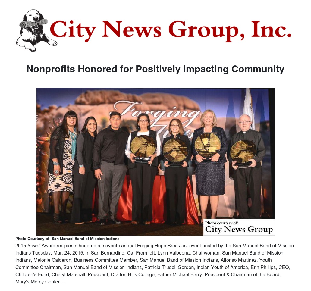 The Children's Fund, Mary's Mercy Center, Crafton Hills Foundation's Increasing Engagement, Employment & Knowledge (ISEEK) program and Indian Youth of America were the four nonprofits receiving San Manuel's prestigious Yawa' Award.